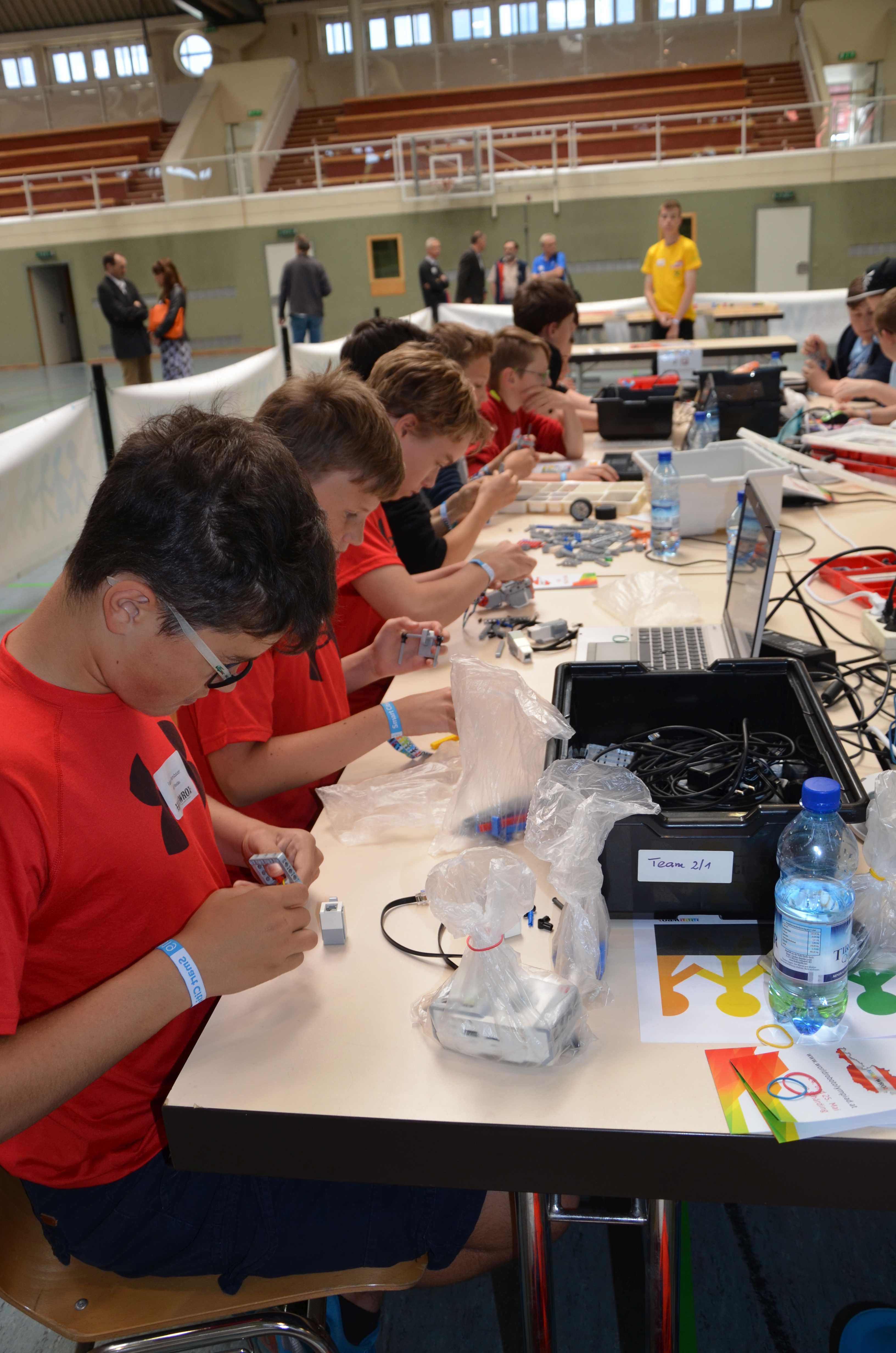 Konzentriert machten sich die Kinder und Jugendlichen daraufhin ans Werk: Sie ließen ihre selbst gebauten Roboter über die Spielflächen flitzen. In der Hoffnung, bei der World Robot Olympiad einen Titel zu erringen.